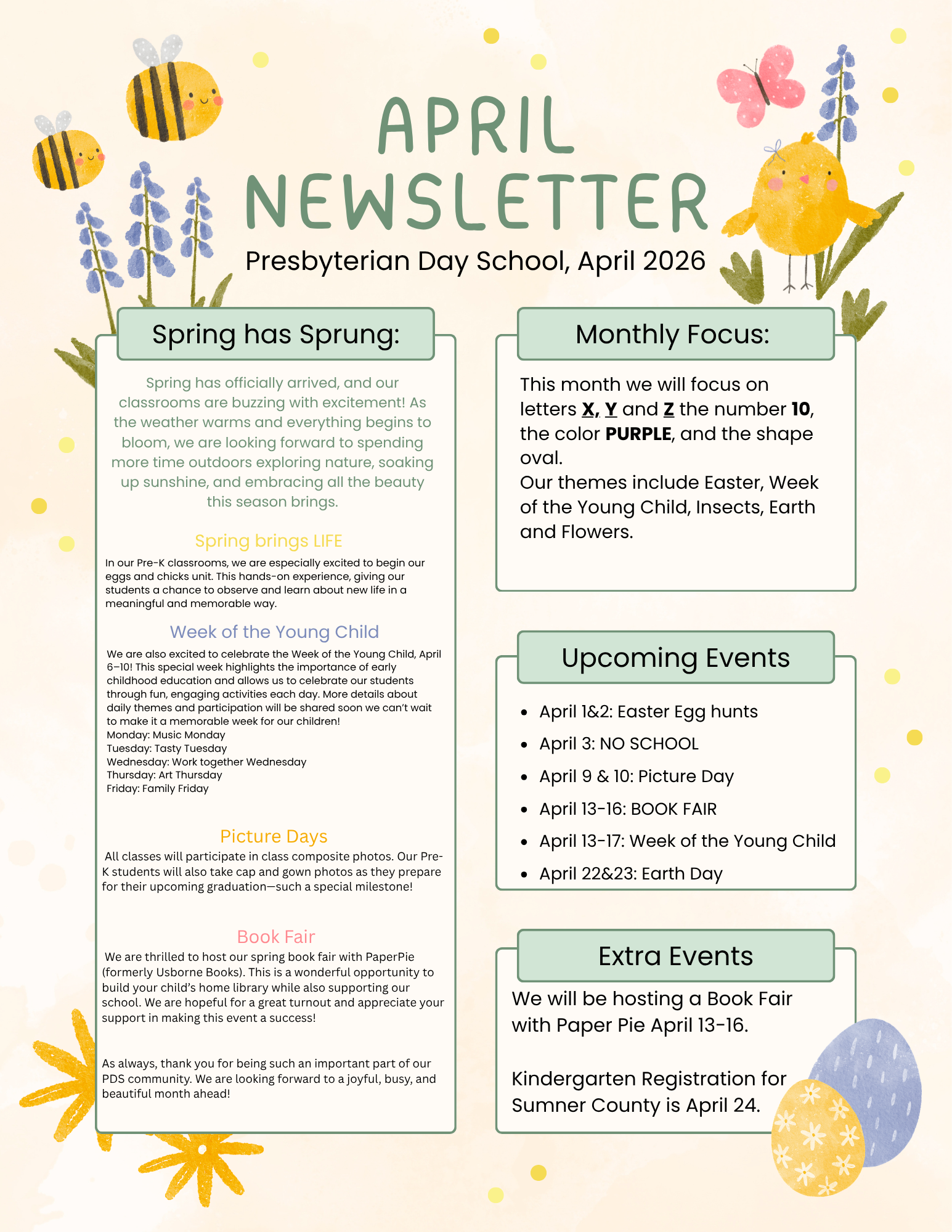Each edition features highlights such as upcoming announcements, a focus topic for the month, upcoming events, and reminders for parents. We encourage you to read through the newsletter to stay engaged and informed about all that is happening at PDS Hendersonville.